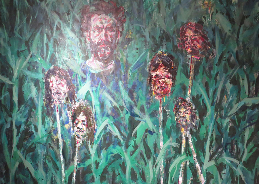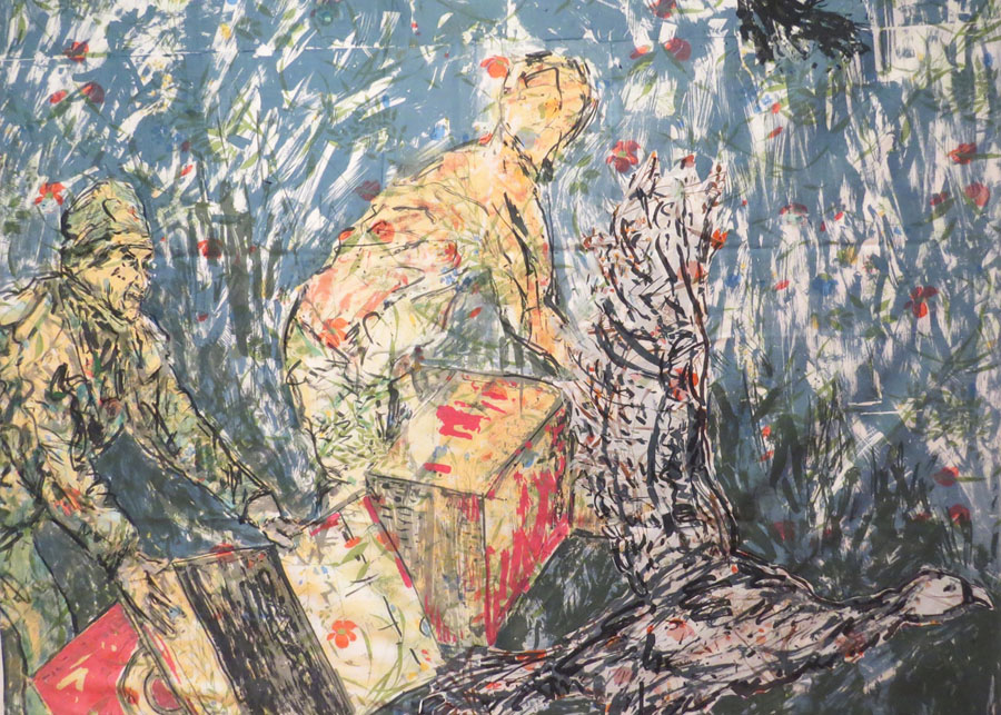 Les images ne sont pas neuves, elles surgissent d’un cycle de brassage et de refonte, affirmant au moment où elles l’entendent qu’elles sont prêtes, faites, mûres et voilà. Elles mettent en scène des moments saillants de vies anonymes, racontés, imaginés, bricolés et rêvés. Chasseur d’oies, dresseur indiscipliné, navigateurs du dimanche, corneille en vol, pelle mécanique, joueur de baseball, bouquet de fleurs ou contorsionniste maison; les estampes, peintures et dessins sont créés dans l’abondance des sources, découpures et croisements. Le dessin est une transcription de ce qui est vu, où entre l’œil et la main se déploie un bazar de souvenirs, de références, d’homme qui a vu l’ours, de raccourcis, de pistes brouillées et de conditions climatiques. Rien n’est perdu dans ce foisonnement d’idées assemblées, cousues et détricotées, de pensées en étages, de musiques collectionnées en vrac. Les images sont ancrées dans un réel qui n’a d’égal que l’atelier lui-même, lieu de tous les échantillonnages. Il faut y entrer et laisser son esprit vagabonder quelques instants pour découvrir que les associations d’images qui trament les œuvres sont moins saugrenues que naturelles : elles matérialisent des instants étincelants harponnés vifs dans un flot ininterrompu de pensées claires, furtives, éparpillées et vivantes. Les images ne s’usent pas, elles émergent et replongent selon leurs propres saisons.