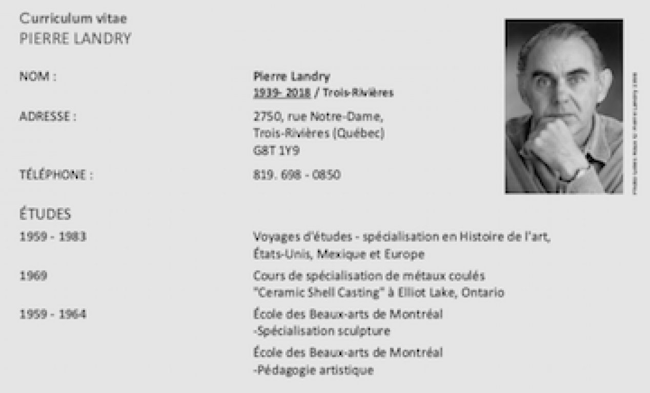 Trifluvien d’origine, l’artiste Pierre Landry grandit dans un milieu familial où la musique classique, la chanson et la danse nourrissent ses actions quotidiennes. Son père, Monsieur Raoul Landry, fait partie des membres fondateurs de la chorale Orphéon de Trois-Rivières et sa mère, Madame Berthe Dufresne, adore danser. Dès ses 11 ans, il manifeste son intérêt pour la sculpture auprès de son oncle Donat Dufresne, amateur de bateaux, en sculptant de petits bateaux avec son canif à la manière de Léo Arbour, sculpteur de Pointe-du-Lac. Déjà à l’époque, l’artiste Pierre Landry baigne dans l’effervescence suscitée par la parution en 1948 du livre Refus global, manifeste décriant le conservatisme politique et religieux de la société québécoise. Après ses études primaires et secondaires à Trois-Rivières, il étudie à l’École des Beaux-Arts de Montréal en pleine Révolution tranquille, caractérisée par d’importants changements sociaux. Par la suite, il revient dans sa ville natale, où il poursuit avec fougue sa création et son investissement dans le développement et la mise en valeur de la vie artistique régionale, nationale et internationale