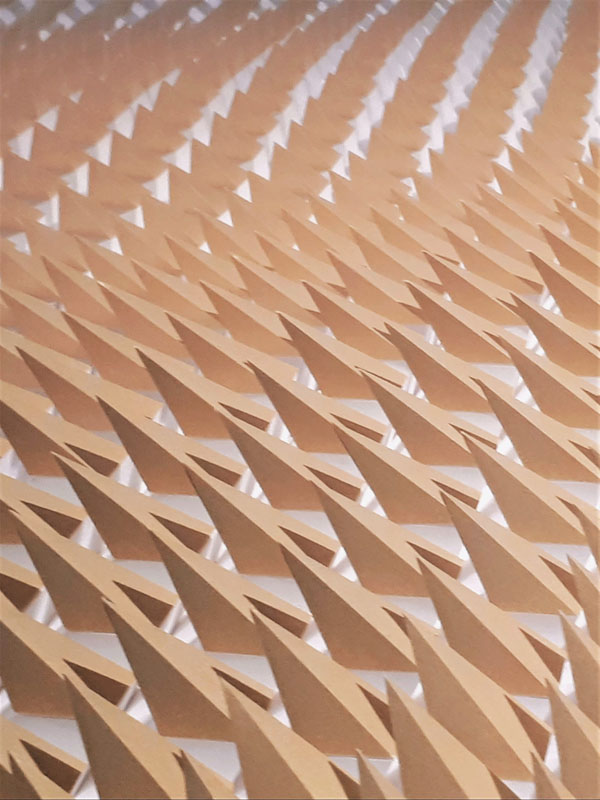 Il a étudié le verre, la peinture, la performance et le son avant de se diriger vers la sculpture et lepapier. Sa recherche est fondée sur l’émerveillement! Matthew Shlian s’inspire principalement des formations de cellules, des tuiles islamiques, de l’architecture, de la musique et de la complexité de la nature. C’est le matériau qui guide son travail! Pour lui, il n’est pas nécessaire d’avoir une idée précise au départ puisqu’au final c’est le papier qui décide où se dirige l’œuvre.