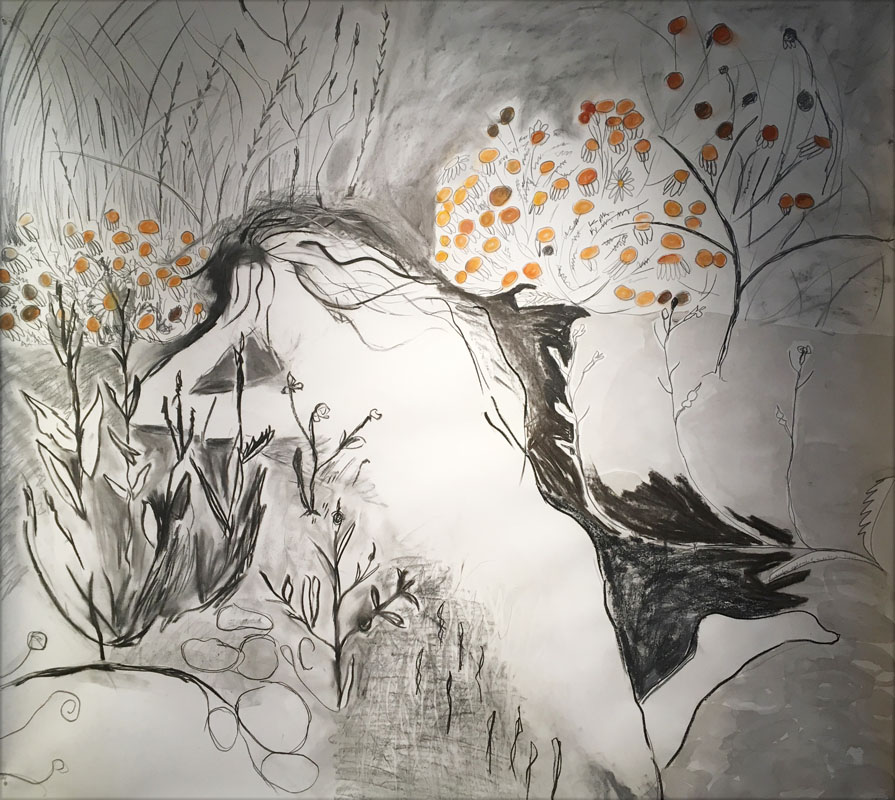 Plus tard, j’ai cherché comment trouver refuge pour du repos et de la rêverie sur une île du littoral de l’Atlantique Nord, balayée par les vents et les embruns. Cette île, Tariec m’a été racontée par un ami archéologue, elle porte un tertre funéraire, le petit menhir indicateur d’entrée en manifeste la présence. Elle m’a aussi été présentée par un géologue marin qui m’a expliqué les variations de niveau de la mer, l’île unifiée il y a un siècle devient désormais une parmi trois. Quatre dessins au titre jardins enfouis sont nés de cette investigation, telles les 4 saisons.
