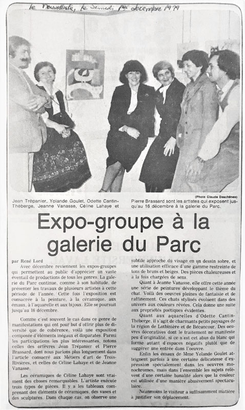 LE DEUXIÈME ARTICLE ‘’Expo-groupe’’, de RENÉ LORD parle des petits formats présentés à la galerie dans la période du mois de décembre. Une tradition qui s’est avérée ponctuelle durant de nombreuses années, donnant l’opportunité d’offrir en cadeau original de grande qualité et par la même occasion susciter l’achat local. Cette édition met en valeur la peinture, la céramique, les émaux, l’aquarelle et les bijoux d’artistes que vous prendrez sûrement plaisir à découvrir en parcourant l’article publié dans Le Nouvelliste du 1er décembre 1979.