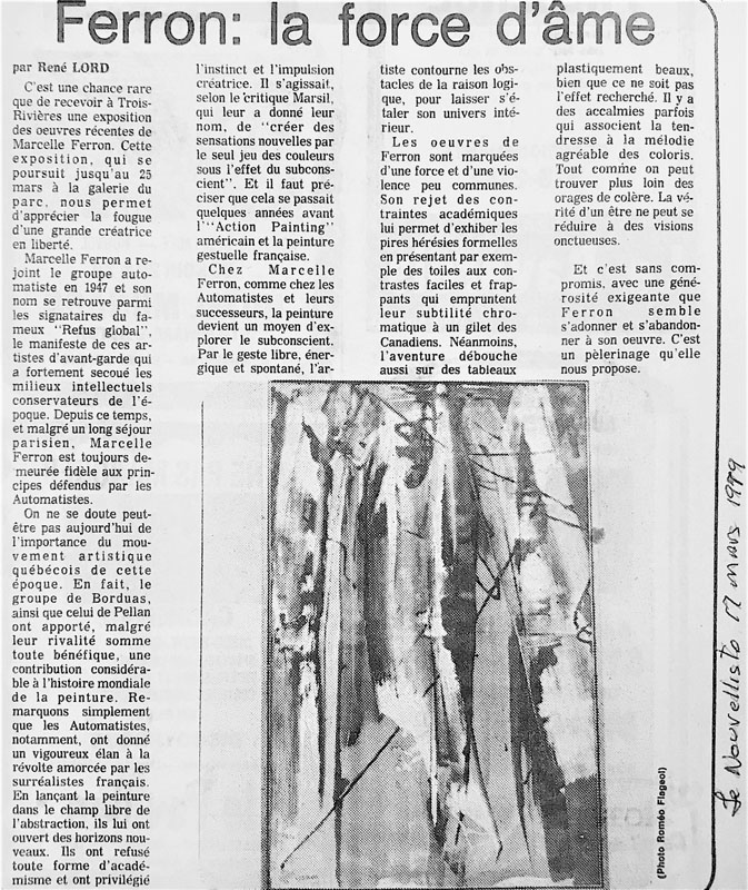 Le premier article choisi ‘’Ferron : la force de l’âme’’, de René Lord, témoigne avec brio de l’importance de l’œuvre de Marcelle Ferron, cette grande artiste qui présente ses œuvres récentes à la Galerie d’art du Parc en mars 1979.