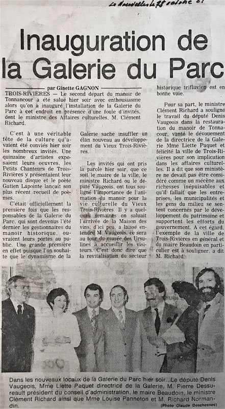 GRANDE CÉLÉBRATION sous l’égide de l’enthousiasme, le 28 octobre 1981, lorsque la Galerie d’art du Parc (GAP) ouvre officiellement ses portes dans le manoir de Tonnancour, situé dans la partie historique de la Ville de Trois-Rivières. Du sous-sol du Pavillon St-Arnaud où elle s’est installée lors de sa fondation en 1972, la Galerie d’art du Parc déménage dans un site historique de cinq étages, comprenant 14 pièces, dont neuf salles d’exposition. Quelle extraordinaire expansion pour la GAP qui fait partie des tout premiers centres d’exposition à avoir été accrédités par le ministère des Affaires culturelles en 1973. Rappelons que depuis déjà 49 années, la Galerie d’art du Parc contribue majestueusement au développement et au rayonnement culturel de la Ville de Trois-Rivières.