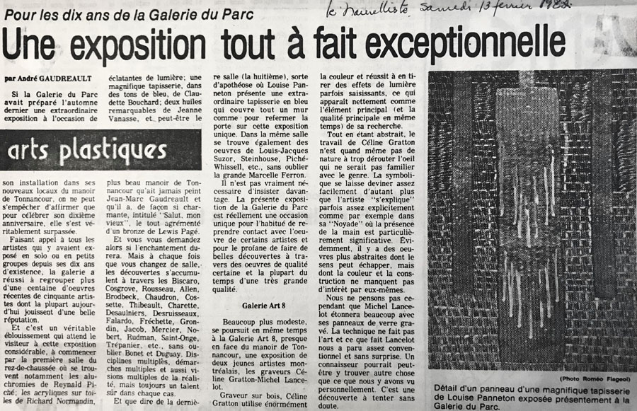 Dans l’article de presse, il est aussi question d’une exposition à la Galerie Art 8, située de biais à la Galerie d’art du Parc. Cette galerie créée par la peintre Colette Cloutier a été un lieu de diffusion, de création et d’éducation auprès des enfants de 1980 à 2000. Colette Cloutier a été une grande complice de la Galerie d’art du Parc à maintes reprises, de la Biennale nationale de céramique, de regroupements d’artistes peintres et des étudiants en arts visuels de l’Université du Québec à Trois-Rivières.
