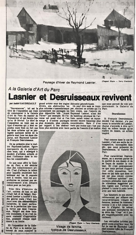 L’exposition ‘’Souvenances’’ présentée à la Galerie d’art du Parc propose des œuvres de l’artiste reconnu Raymond Lasnier et des œuvres de l’artiste moins bien connu François Desruisseaux, tous deux décédés.