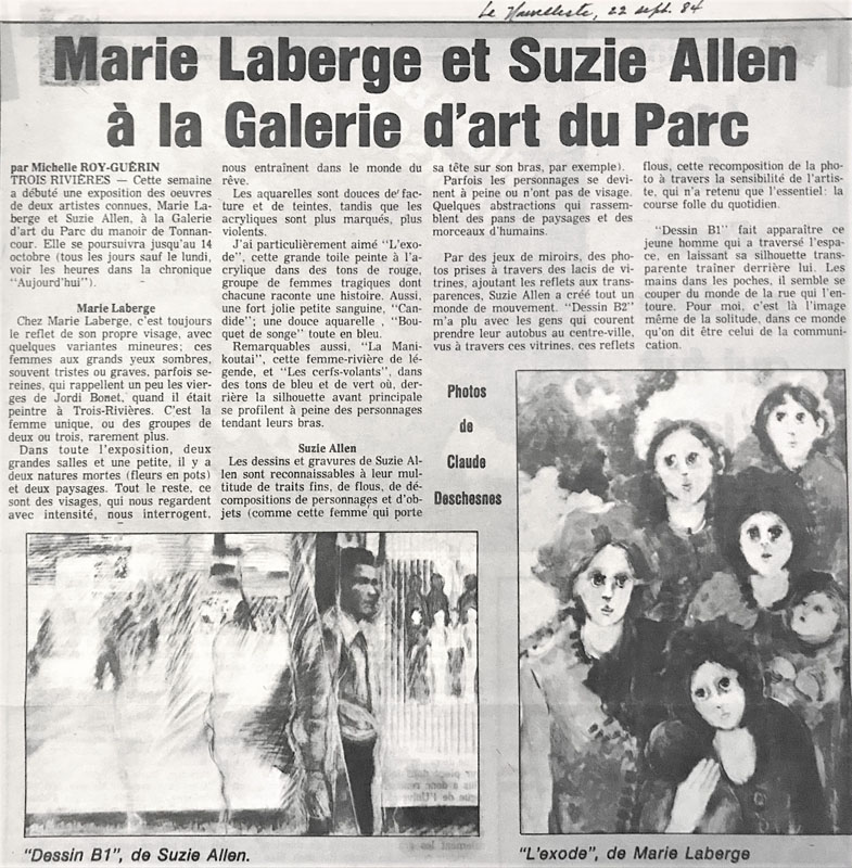 Deux artistes, l’une qui peint, l’autre qui dessine et qui grave se retrouvent cet automne 1984 dans les salles de la Galerie d’art du Parc à Trois-Rivières.