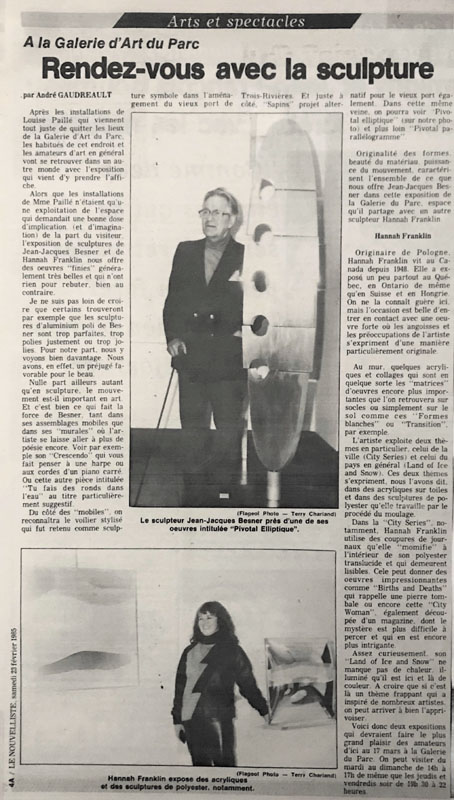 La sculpture est à l’honneur à la galerie avec les œuvres de Jean-Jacques Besner et celles de Hannah Franklin. Il est intéressant de mentionner que nous retrouvons à l’entrée du Parc portuaire de Trois-Rivières une des œuvres de Besner représentant à la fois le conifère et la voile d’un bateau. Elle fait partie du paysage urbain depuis 1984. Les informations complémentaires sur le parcours des artistes proviennent du Dictionnaire historique de la sculpture québécoise au xxe siècle, de WIKIPEDIA et des archives de la Galerie d’art du Parc.