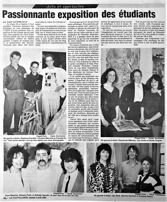 Parmi les finissants de 1988 qui exposaient à la Galerie ART 8 et la GALERIE D’ART DU PARC, nous retrouvions RAYMONDE BÉLIVEAU, FRANÇOIS CARON, LISE DROLET, NATHALIE GAMELIN, STÉPHANE GAUTHIER, NICOLE GRIGNON, CHRISTINE MARCOTTE, ANNE MARICHAL, SUZANNE PARENT, MARQUIS POULIN, LISE RENÉ. Trois autres artistes qui ne figurent pas sur la photo faisaient partie de la cohorte des finissants de 1988. Il est intéressant de mentionner que plusieurs parmi ceux-ci sont encore actifs dans le milieu artistique. Malheureusement, le sculpteur Marquis Poulin qui faisait partie des membres de l’Atelier Silex de Trois-Rivières et qui était très apprécié du milieu est décédé à l’automne 2019.