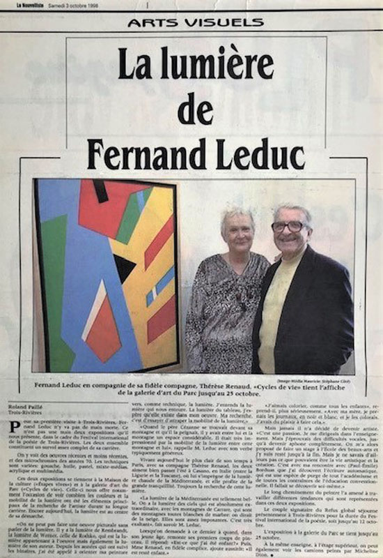 Les œuvres de Fernand Leduc que l’on retrouve dans l’exposition présentée à la Galerie d’art du Parc en octobre 1998, témoignent de la gestuelle, de l’intensité de la couleur et de la mobilité de la lumière!