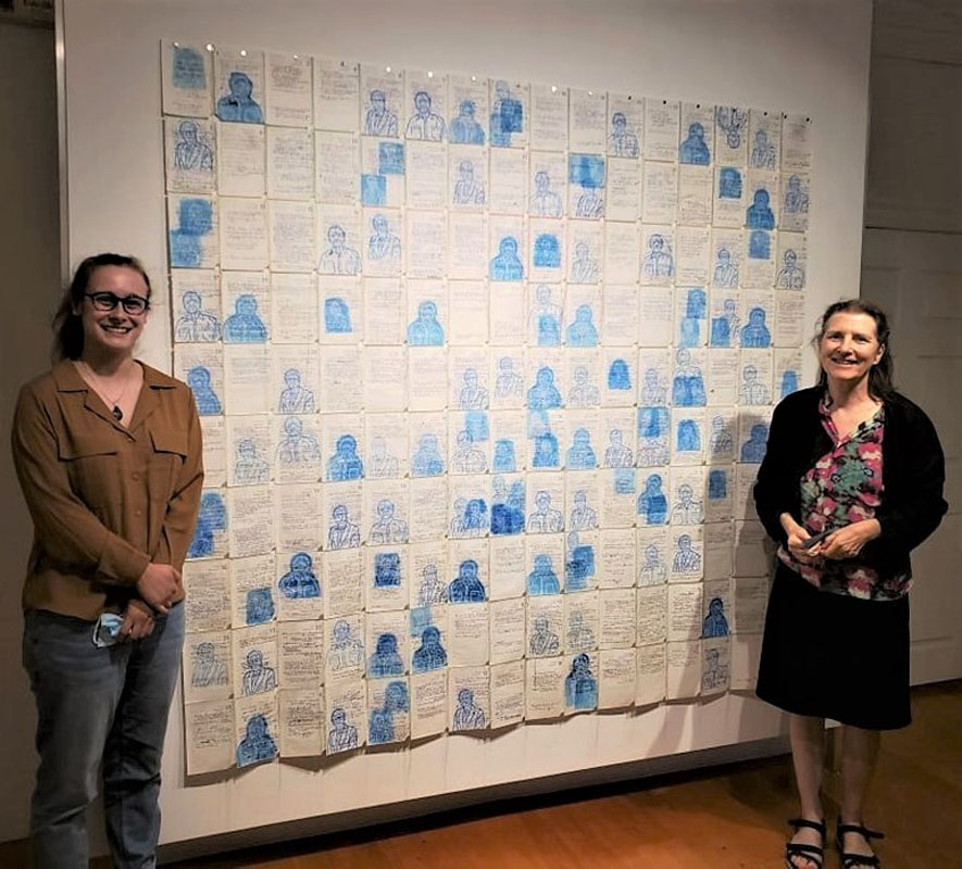 Présentement à la Galerie d’art du Parc pour la 12e biennale internationale d’estampe contemporaine de Trois-Rivières, Anne Billy propose une œuvre émouvante qui s’intitule « Je, Jean-Marc, j’étais il », présentée comme une courtepointe qui intègre les pages de l’agenda de son père atteint d’Alzheimer. Elle est restée longtemps à ses côtés comme aidante naturelle jusqu’à son décès. Homme de science, le père d’Anne Billy écrivait tout à la lettre, précis et systématiques dans ses notes. Pour bien représenter son père, l’artiste multidisciplinaire a imprimé le portrait de son père à chaque mention du « Je » ou de ses initiales « JM » dans les pages de son agenda. Les pages sont cousues àla main avec des fils ballants et visibles. La couleur des fils n’est pas laissée au hasard ; ceux-ci sont choisis et brodés selon les saisons, comme le rouge représente l’automne. Anne Billy dit même : « Les jours se lient au fil du temps et alors, je me relie à ces jours passés. »