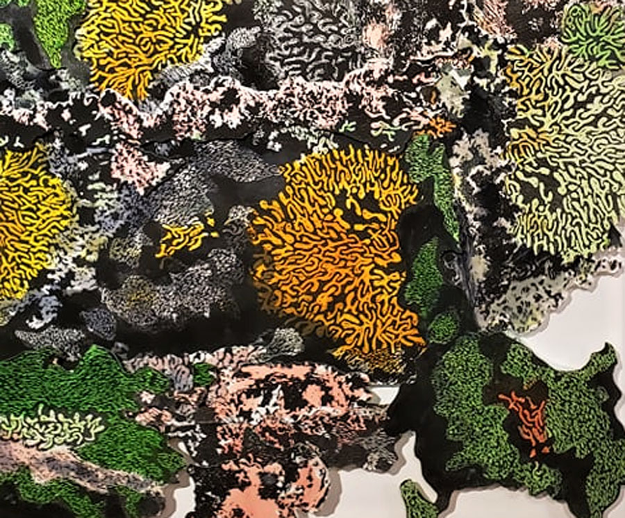 Détail de « Lichen 5 », Bois gravé et assemblage, 2020, Chantal Harvey