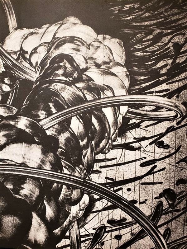 Pour revenir à notre artiste coup de cœur, cinq œuvres de Tomasz Winiarski sont exposées à la Galerie d’art du Parc et sont issues de la série Perpetuum mobile, sur laquelle il travaille depuis plus d’une décennie. Sa démarche artistique tourne autour du développement des motifs, de problèmes formels et de solutions élaborées sur plusieurs années, ce qui, selon moi, est un mélange d’abstrait et de figuratif, de blanc pur et de noir d’encre. Pour Tomasz Winiarski, l’art contemporain est une entité, une image qui se défend d’elle-même. Cette façon de penser est présente dans la pratique de celui-ci. Il fait des références à des éléments de la réalité, qui permettent au public de construire leur propre interprétation des œuvres.
