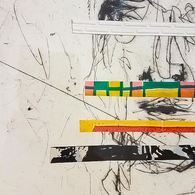 La pratique d’Outers se déploie majoritairement dans les médiums de la sérigraphie et de la gravure par pointe sèche, auxquels il se plait à y ajouter peinture, papier peint, vieux dépliant ou carte en les superposant au dessin. Ces ajouts colorés dynamisent ainsi ses compositions, attrapent l’œil et l’accumulation des motifs agit comme métaphore pour la variété et la succession de couches qui constituent l’humain et son invariable complexité. Dans ses gravures, l’artiste a un trait vif et il laisse des zones de sa plaque moins essuyées, donnant presque à ses images imprimées l’apparence d’un croquis au fusain. Couplée à l’ajout des morceaux de papier aux motifs éclatés, cette technique de trait permet aux œuvres d’émaner une expressivité visuelle peu commune dans le domaine de la gravure sur cuivre. Les plus observateurs remarqueront peut-être les plus subtils gaufrages dans l’œuvre Chantier en cours : l’artiste utilise cette technique afin de faire référence à quelque chose qui aurait disparu ou, au contraire, au potentiel d’une présence future.