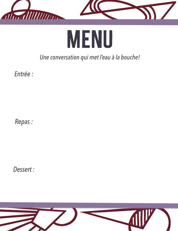 Premièrement, dessinez votre propre menu ‘’Une conversation qui met l'eau à la bouche!’’ en vous inspirant du menu de Alison, puis remplissez les espaces : entrée, repas et dessert de trois questions que vous aimeriez poser à un ami, un parent ou un proche.