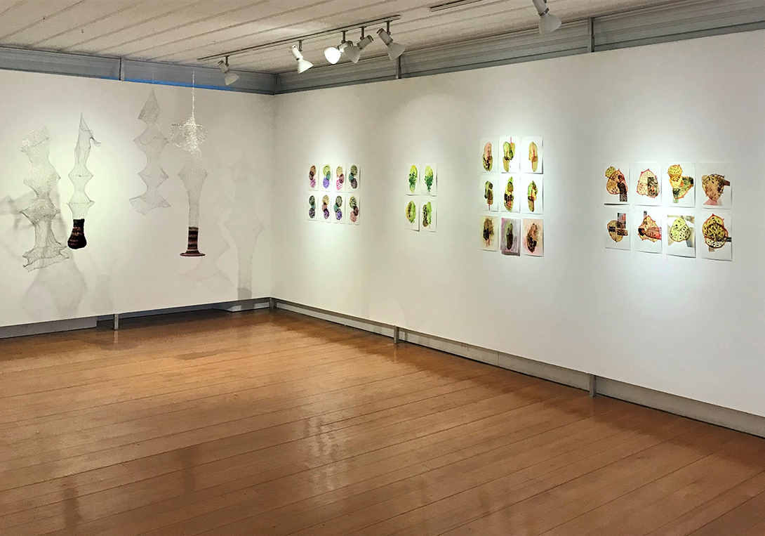 Si les corpus d’œuvres sur papier et les sculptures suspendues peuvent sembler tirer leurs sources d’explorations distinctes, elles ont en commun de se développer à partir de l’adjonction de petits éléments accumulés, sortes d’unités de base qui ensembles, créent de nouveaux tout. Les dessins à l’aquarelle de plantes – racines, semences, graines, feuilles, etc. – se succèdent dans une série où la répétition met simultanément en valeur l’unicité de chaque motif et la fécondité propre à la nature. De même, les perles tissées donnent corps à des formes qui rappellent les structures cellulaires ou encore les constellations, des symboles du vivant où l’on passe du microscopique au macroscopique. Ce rapprochement iconographique est réifié par l’utilisation de la lumière, qui prend une place de plus en plus importante dans la démarche de Claire Beaulieu et met en valeur les qualités diaphanes du verre et ses possibilités d’évocation. Les ombres portées, sur les murs ou le sol, tissent d’inextricables toiles autour des sculptures de perles, contribuant ainsi à les inscrire dans l’espace d’exposition en leur donnant une plus forte présence que ce que la fragilité de leur construction pourrait suggérer.